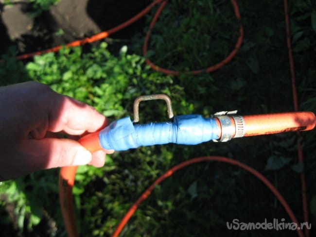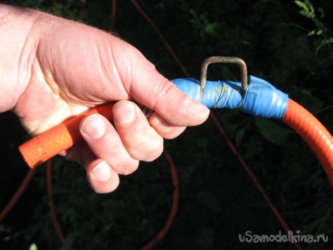 Шаг 2. Отступаем от конца садового шланга на 15-20 см, и прикручиваем к нему проволочную скобу при помощи изоленты.