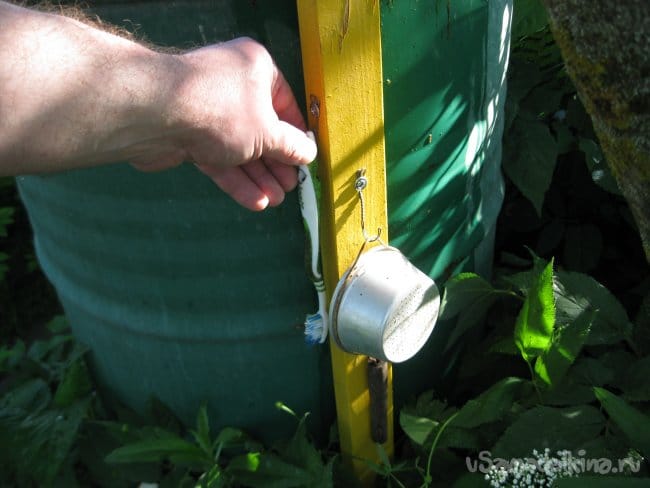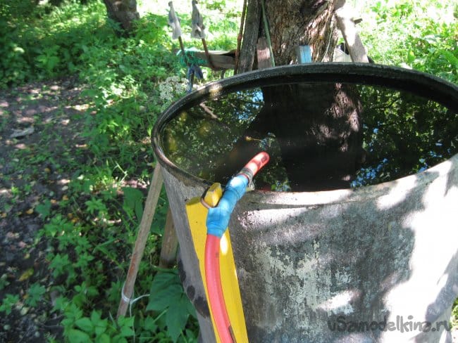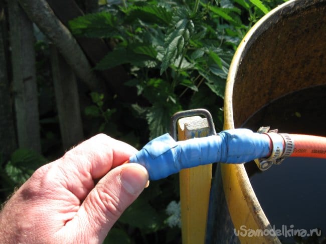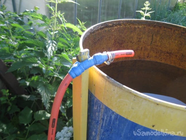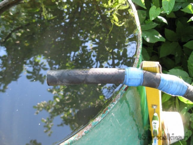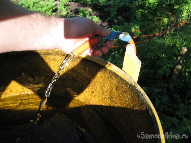 Так, например, некоторые садоводы, прижимают шланг, положенный на бочку досками или прикрепляют к концу шланга грузик, чтобы конец шланга не выскочил из бочки. Другие садоводы опускают шланг в бочку до самого дна, да еще и закладывают на дно бочки несколько свернутых колец шланга, чтобы он гарантированно не выскочил. Словом, каждый выкручивается, как может.