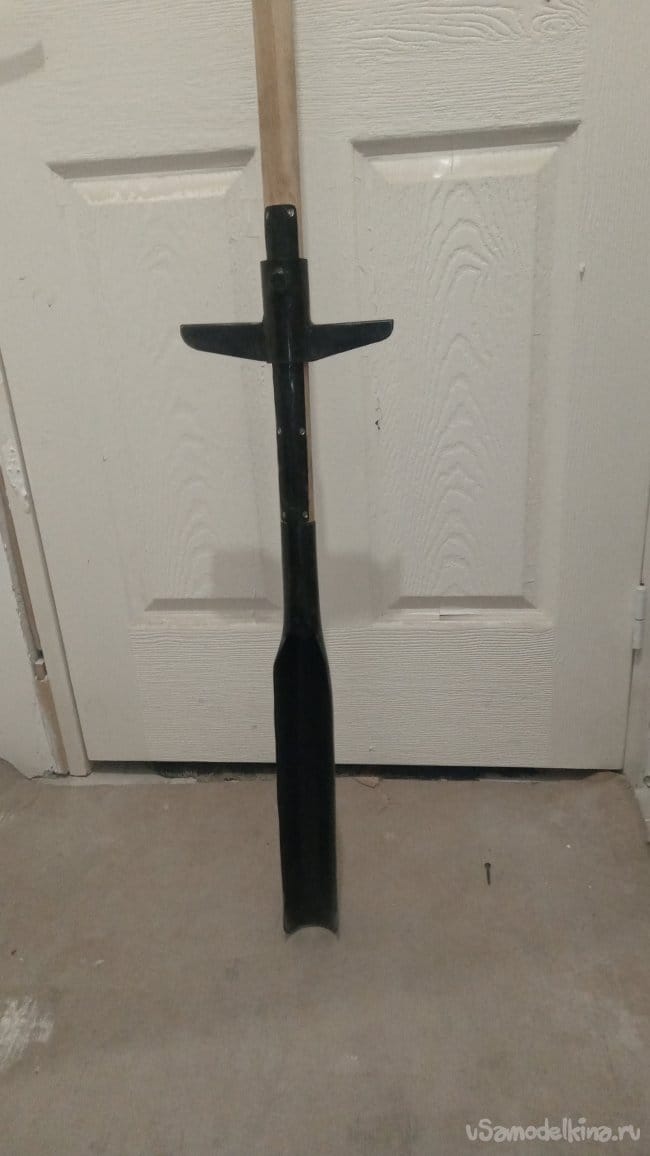 (Напомню. Как и в прошлой версии лопаты, основной штык делается такой длины, чтобы удобно было ставить на упор ногу. Если же нам необходимо выкопать траншею, глубина которой больше, чем длина штыка, делать это придётся за несколько заходов. После первого прохода упоры для ног переставляются выше. Так как при этом лопата находится в яме, а мы стоим наверху, неудобств из за этого не возникает. Устройство прошлой лопаты позволяло копать траншею, глубиной до семидесяти сантиметров. Эту я решил сделать с теми-же параметрами.)