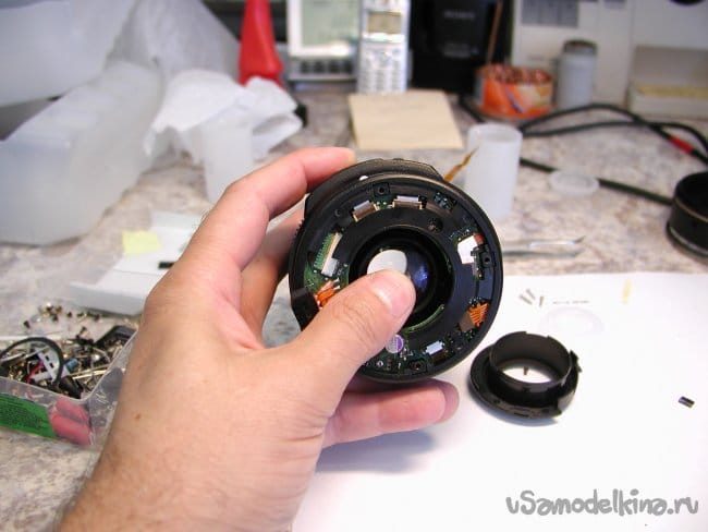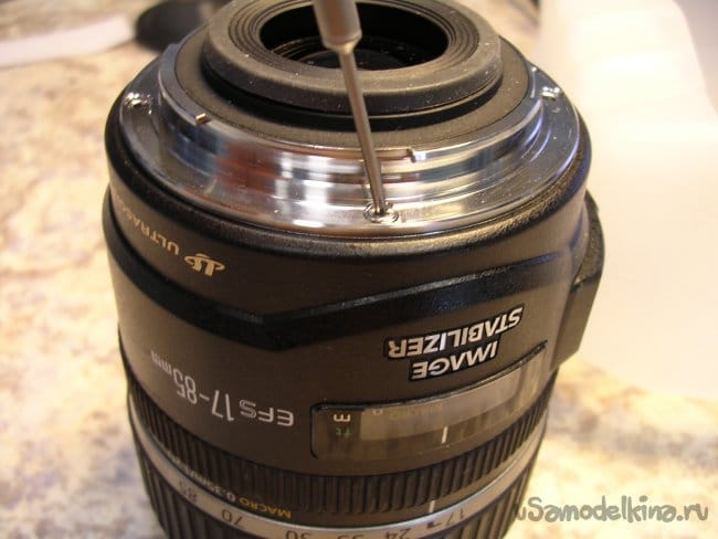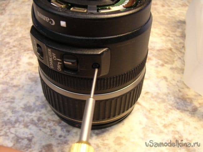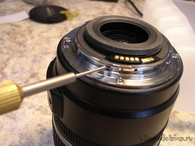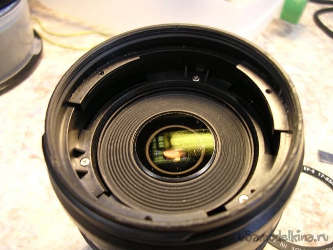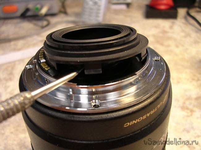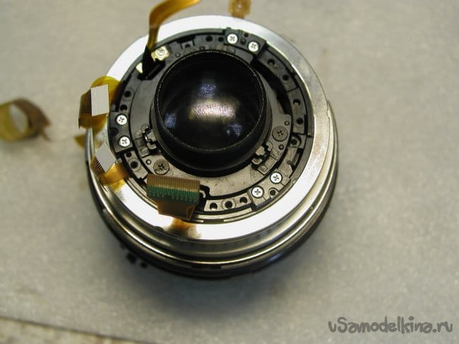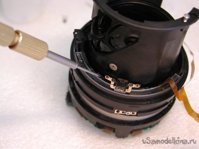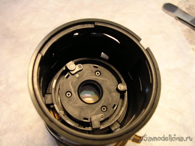 Для дальнейшего разбора объектива придется снять фронтальную линзу. Неприятная процедура. Поскольку линза установлена на конических подушках и в процессе регулировки ее установили в определенное положение. Если смонтировать неправильно, резкость уедет в определенных положениях зума. Поэтому делаю контрольные штрихи шилом по пластику и только после разметки снимаю линзу.