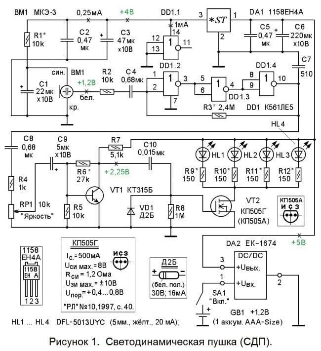 Во время переходных процессов, сопровождающих момент включения питания, светодиоды HL1 … HL4 вспыхивают и через 0,5 … 1 секунды гаснут. Если регулятор «Яркость» установлен в нижнее (по схеме) положение, то, несмотря на звуковые колебания, воздействующие на микрофон BM1, на вход усилительного каскада VT1 R5 R6 R7 переменная составляющая не поступает, и все (HL1 … HL4) светодиоды остаются чуть ниже порога зажигания.