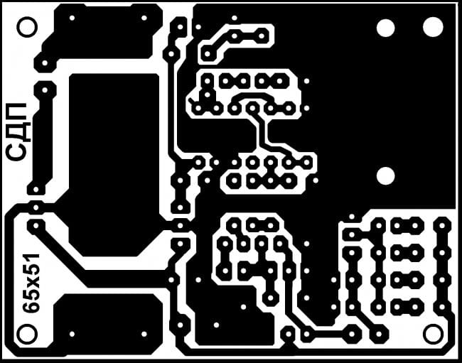 Печатная плата СДП выполнена из односторонне фольгированного стеклотекстолита размером 65 х 51 х 2 мм. (см. рисунки 2 и 3).