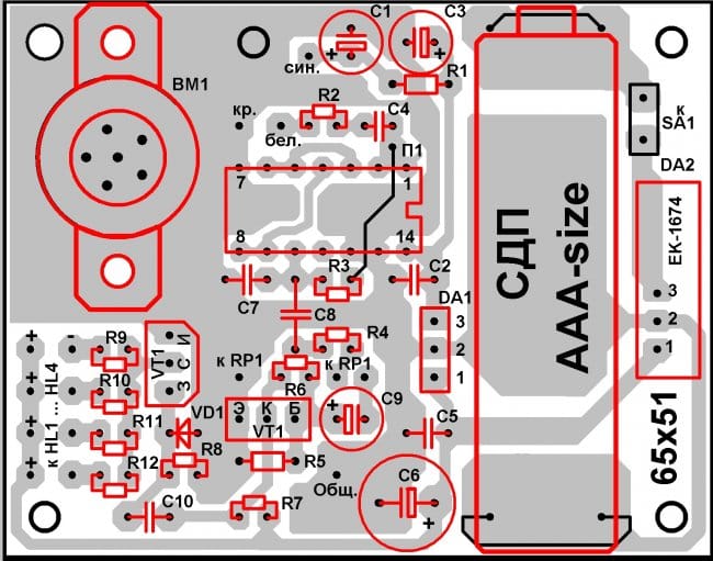 В СДП применены резисторы типа С2-33, МЛТ с мощностью рассеивания 0,125 Ватта. Потенциометр RP1 - СП3-4вМ (с выключателем), СП4-1 (без выключателя) или подобный с сопротивлением 8,2 кОм … 33 кОм. Конденсаторы С1, С3, С6, С9 оксидные типа К50-35 или зарубежного производства, например, серии CFM фирмы «Maron» или серии ТК фирмы «Jamicon». Остальные - керамические типа КМ6, К10-17 или малогабаритные зарубежных фирм. Диод VD1 Д2Б можно заменить КД503, КД510, КД520 … КД522 с любой буквой. Микросхему DD1 К561ЛЕ5 (CD4001A) в крайнем случае можно заменить К561ЛА7 (CD4011A), однако при этом потребляемый СДП ток возрастёт на 1 … 2 мА, что немаловажно при батарейном питании. Светодиоды HL1 … HL4 - любые суперъяркие диаметром 5 мм. Жёлтые светодиоды DFL-5013UYC (ARL-5013UYC) можно заменить красными ARL2-5113URC или зелёными ARL-5213PGC, OSBG5111A–VW (18 cd, 20 мА). Биполярный транзистор VT1 - КТ315 с любой буквой и коэффициентом усиления по току не менее 100 … 200. Лучшая замена транзистору КП505Г - КП505А. Интегральный стабилизатор DA1 можно заменить 78L33 или более экономичным 1158ЕН3А (оба - с кремниевым диодом «вольтодобавки», включённым в цепь вывода 2 DD1). Микрофон электретный МКЭ-3 (ИЦ3. 842. 375 ТУ) при изменении схемы включения можно заменить, например, NMC. Тумблер SA1 - SMTS102 или любой другой малогабаритный, коммутирующий ток не менее 200 мА. Тумблер SA1 по желанию, можно исключить, а в позиции RP1 применить потенциометр с выключателем типа СП3-4вМ (для этого случая применяют рисунок ФП (Фальшпанели), изображённый на рисунках 4 А и Б). Пайку радиоэлектронных компонентов следует вести заземлённым жалом паяльника. Для ИМС DD1 рекомендуется применить специальную розетку (сокету) DIP-14.