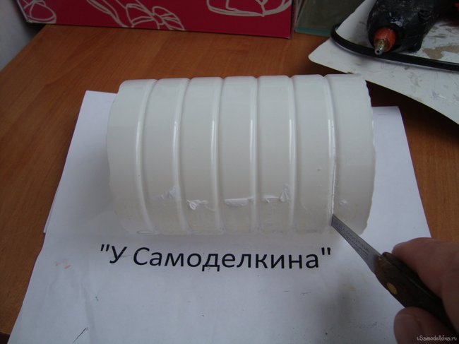 Когда ножки готовы, сделаем мыльное ложе- для этого разрезаем вдоль с двух сторон, полученный из пластиковой бутылки, цилиндр.