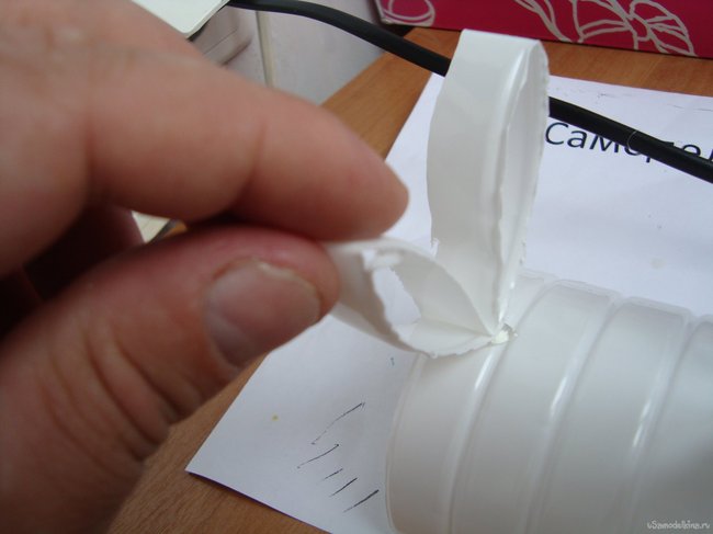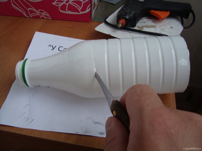 Также срезаем горловину, там где оно, непосредственно, переходит в основную часть бутылки.
