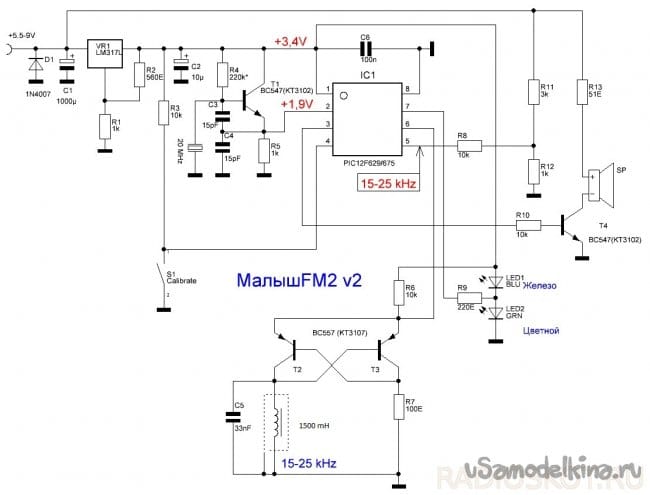 Диод D1 на входе питания схемы защищает от переполюсовки, стабилизатор LM317 настроен на выходное напряжение 3,4В, от которого питается микроконтроллер. На транзисторе Т1 собран генератор, который тактирует микроконтроллер. Важной частью схемы является конденсатор С5, который совместно с катушкой образует колебательный контур. Его ёмкость должны быть максимальной стабильной и не меняться при изменении температуры, иначе частота колебательного контура будет меняться не только от поднесения металлических предметов в катушки, но и от неустойчивости конденсатора, что приведёт к ложным срабатываниям. Лучше всего здесь применять плёночные конденсаторы, однозначно неподходящими считаются керамические. Два светодиода на схеме сигнализируют о срабатывании, один соответствует чёрному металлу, другой - цветному. Обратите внимание, что хотя бы один из светодиодов должен быть синим - это связано с падением напряжения на светодиоде и особенностями схемы. Транзистор Т4 усиливает звуковой сигнал об обнаружении, воспроизводить звук можно либо на наушниках, либо на миниатюрном динамике, например, от телефона. Единственным органом управления металлоискателя является кнопка калибровки, при её нажатии микроконтроллер считывает частоту колебаний генератора и принимает её за эталонную, поэтому при нажатии данной кнопки рядом с катушкой не должно быть никаких металлических предметов. В процессе работы иногда частота может меняться, например, от резкого изменения температуры, и металлоискатель начинает издавать непрерывное ложное срабатывания - в таких случаях требуется нажатие кнопки.
