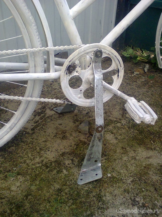 Для того, чтобы он устойчиво стоял, и не падал делаем боковые упоры из стальных полосок. Эти упоры закрепляем при помощи болтов и гаек М 6 к звездочке велосипеда по бокам.