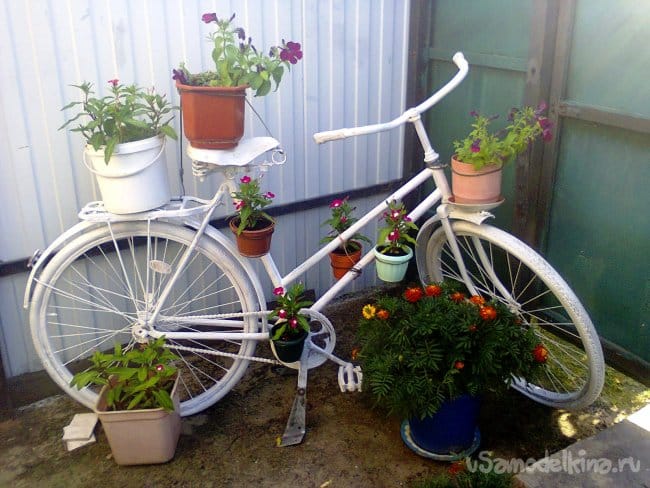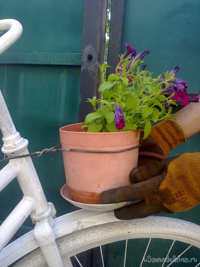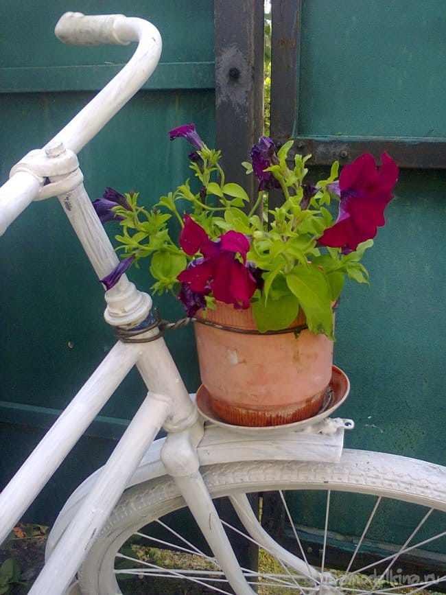 Материалы: старый нерабочий велосипед, маленькая баночка белой краски, малярная кисть -1шт, стальная проволока толщиной 3-4мм -3 метра, стальные полоски, размером 30*3мм -1 метр, болты и гайки М 6 -10 шт, цветы в горшках – 5-10шт.