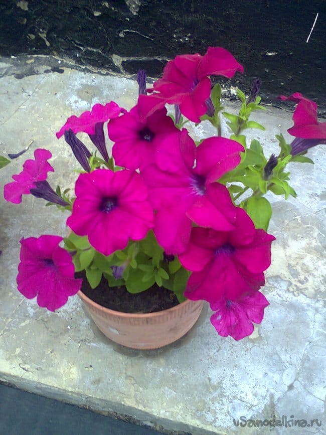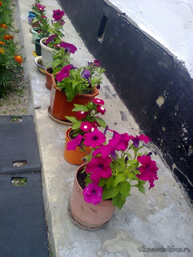 В кольцах размещаем горшки с цветами, желательно цветущими.