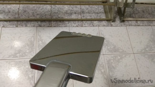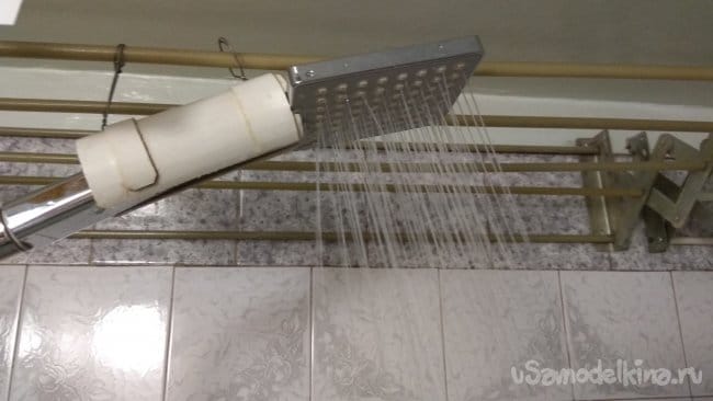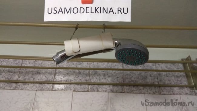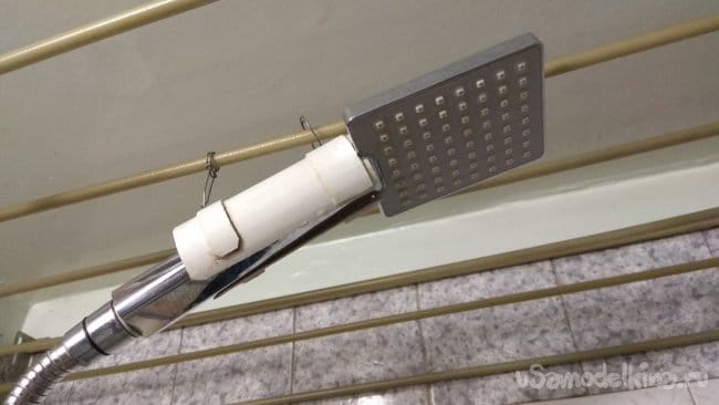 Держатель был очень неудобный. Штанга держателя была раза в два длиннее, чем на фото, шарнирное крепление держалось плохо, приходилось его постоянно поджимать. Когда оно треснуло и совсем перестало держаться, отец придумал закрепить держатель лейки на сушилке для белья, просверлил в держателе пару отверстий и прикрутил его нихромовой проволокой на сушилке. Когда в очередной раз поменяли смеситель, пришлось сделать новый держатель, в старом держателе новая лейка совсем не держалась.