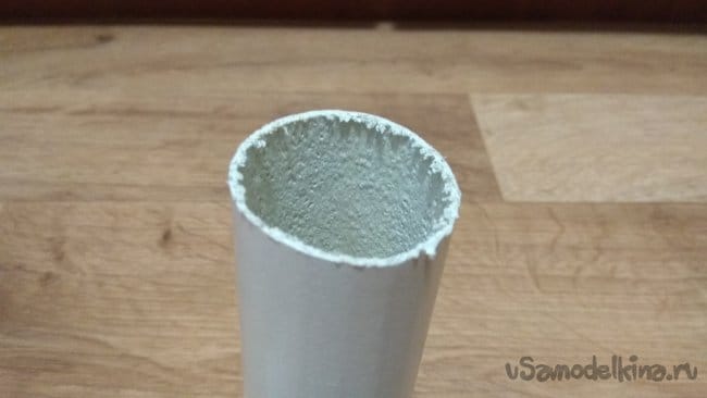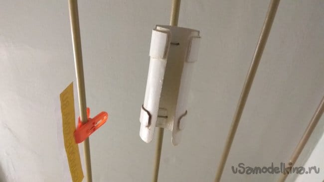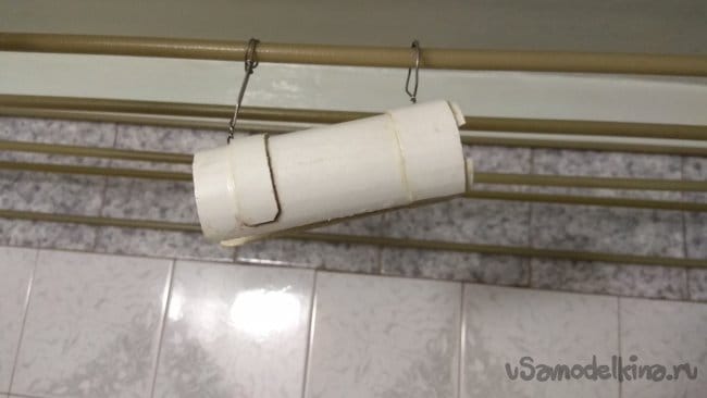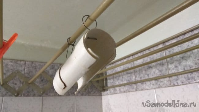 Отрезал от нее заготовку длинной 10 см и прорезал по длине паз для шланга. Труба оказалась очень мягкая, пришлось ее усилить, приклеив пару кусочков трубы, иначе лейка выпадала из держателя. Сверлим отверстия для проволоки и закрепляем держатель за сушилку.