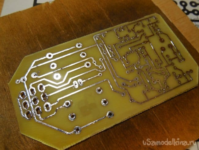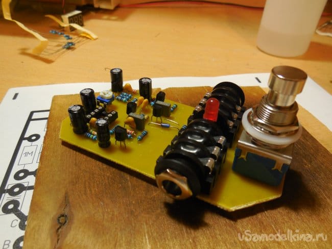 Собирается вся схема на прямоугольной печатной плате, я развёл печатную плату таким образом, что на неё устанавливаются и гнёзда входа-выхода для инструментального штекера jack 6.3, а также сама ножная кнопка переключения. Скачать плату можно в архиве в конце статьи. Изготавливается плата стандартным ЛУТ-методом. При сборке по печатной плате следует сперва примерить размеры имеющихся компонентов к посадочным местам на плате и при необходимости подкорректировать последние. Фотографии процесса изготовления: