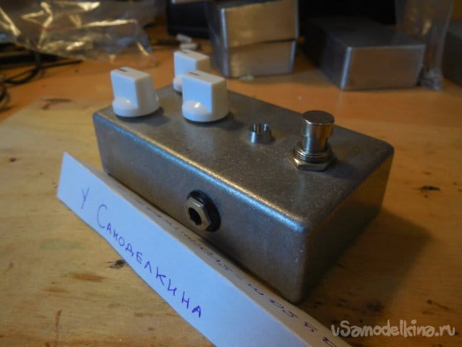 Устанавливается плата в силуминовый корпус Gainta G0124, который идеально подходит для размещения внутри платы 50х100 мм. Крепится плата внутри благодаря гайкам на разъёмах и на кнопке. Сверлить отверстия в корпусе следует сперва вымерив все расстояния на плате - между гнёздами и кнопкой, светодиодом, в свободном месте следует расположить гнездо питания и потенциометры. Напряжение питания схемы составляет 9-12В, подойдёт любой сетевой адаптер или блок питания, важно, чтобы он не давал помех на выходе. Потребление схемы составляет около 10-20 мА, для питания подойдёт так же Крона, но она может легко разрядится в самый неподходящий момент. Монтаж платы в корпус не представляет никаких проблем, если сперва были произведены все замеры и отверстия проделаны в нужных местах, очень пригодится здесь правило "7 раз отмерь - 1 отрежь". Фото полностью собранной педали представлено ниже. Удачной сборки!