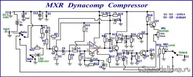 Существуют буквально тысячи различных педалек с совершенно разными эффектами, начиная от гитарных синтезаторов, заканчивая мощными дисторшенами. Каждый из эффектов имеет своё место в музыке и подходит для использования в определённом жанре. Один из гитарных эффектов называется компрессором, однако ничего общего с компрессорами в привычном понимании слова он не имеет. Занимается этот эффект тем, что делает звучание гитары более ярким и выразительным, поднимает по громкости тихо сыгранные ноты, и слегка приглушает громкие элементы. Как отмечают некоторые гитаристы, компрессор делает звук гитары менее "пластмассовым". Ниже представлена схема для сборки педали-компрессора под названием Dyna Comp, выпускается такая педаль компанией MXR ещё с конца прошлого века, за годы своего существования она получила множество хороших отзывов от гитаристов.