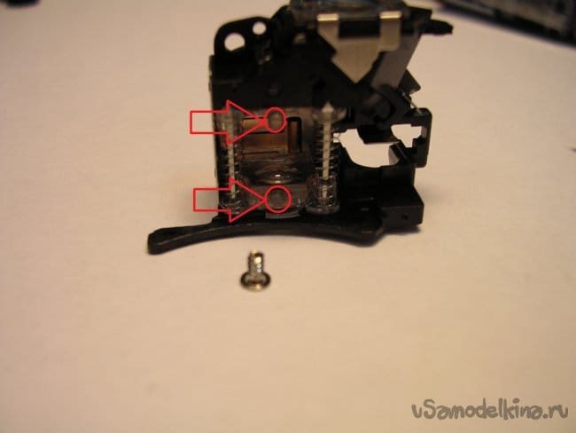 Через полчаса нежных и осторожный действий удалось немного задвинуть баррели до конечного положения. И вижу поврежденный пин. Это один из трех пинов на амортизации. Даже пружиночка есть.