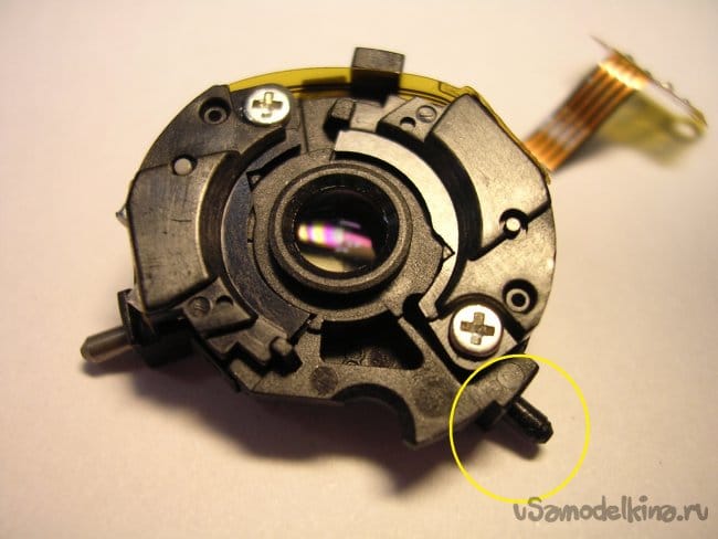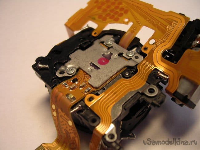 Как я уже говорил матрица устанавливается на специальные прокладки, регулирующие её расстояние от последней линзы. И дополнительно фиксируются каплями клея. Если нужно снимать матрицу, эти капли можно прожечь паяльником и затем откручивать винты крепления матрицы.