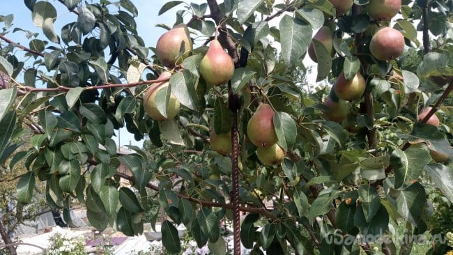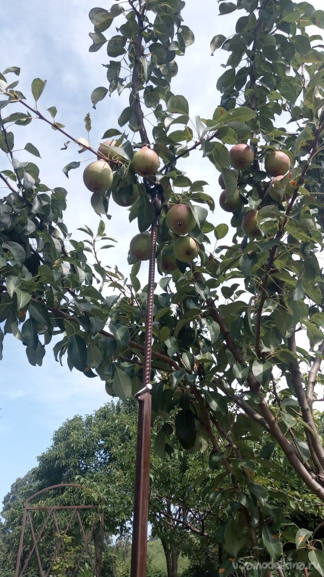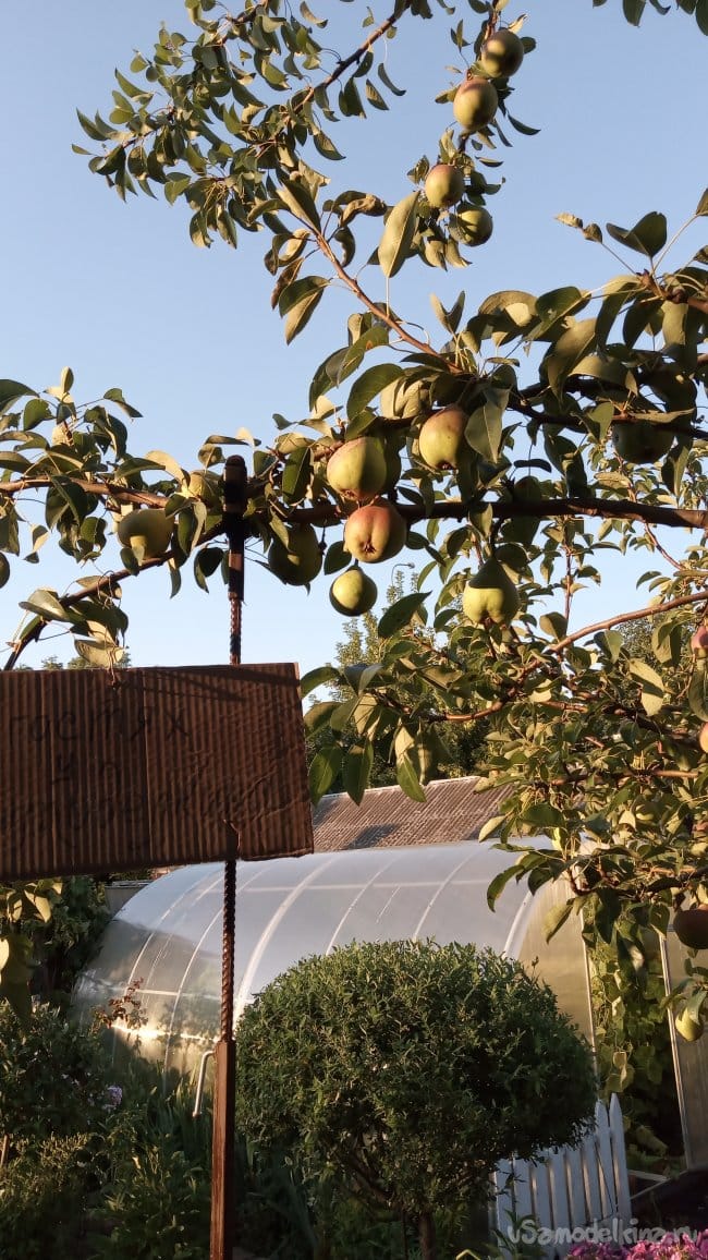 У меня на участке, кроме вишен, слив и абрикосов, есть шесть плодовых деревьев - яблони и груши. Все они - среднерослых сортов. Высота деревьев не превышает трёх метров. Такие деревья удобны - не приходится собирать плоды с большой высоты . К тому-же, небольшое плодовое дерево не создаёт большую тень и не обезвоживает обширный участок, позволяя расти другим растениям. (В основном - цветочным). Но возникает другая проблема. У небольших деревьев ветви не отличаются большой толщиной. И, когда наливаются плоды, ветви могут легко сломаться под их тяжестью. В этом году у нас яблоки уродились не особо хорошо, но вот, урожай груш обещает быть обильным: