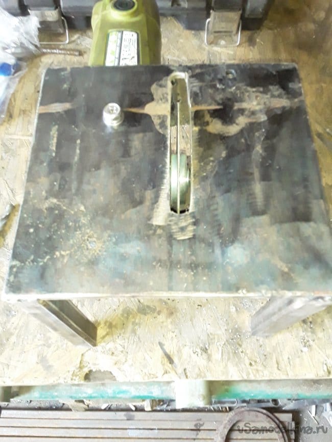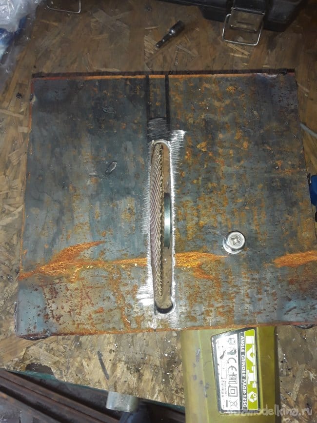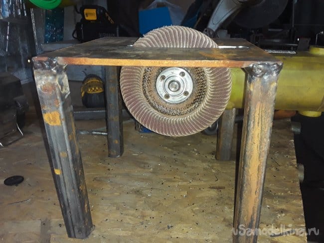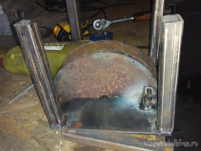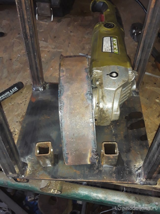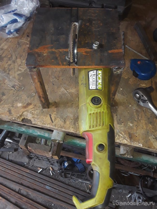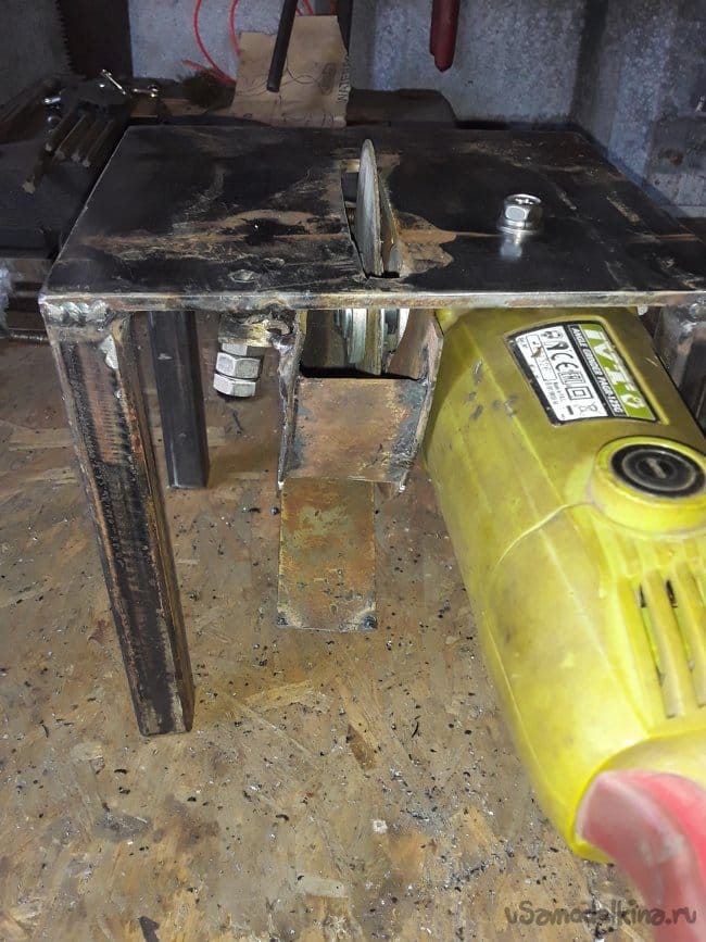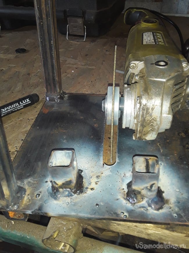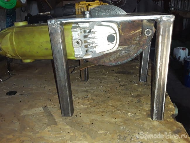 Сделав разметку просверливаю два отверстия для того чтобы края распила были ровные и прорезаю болгаркой ширину сделал 2 см для того чтобы можно было ставить лепестковый шлифовочный диск. Далее для того, чтобы удобно было ставить и снимать болгарку привариваю 4 куска профиля 20 на 20, как ножки так будет удобнее. Для крепления самой болгарки просто приложив на свое место делаю отметку и просверливаю отверстие и закручиваю болт на место для крепления рукояти. Такой крепеж вполне очень даже надежный ничего при работе не отвалится проверено.