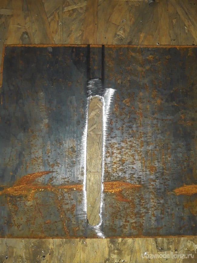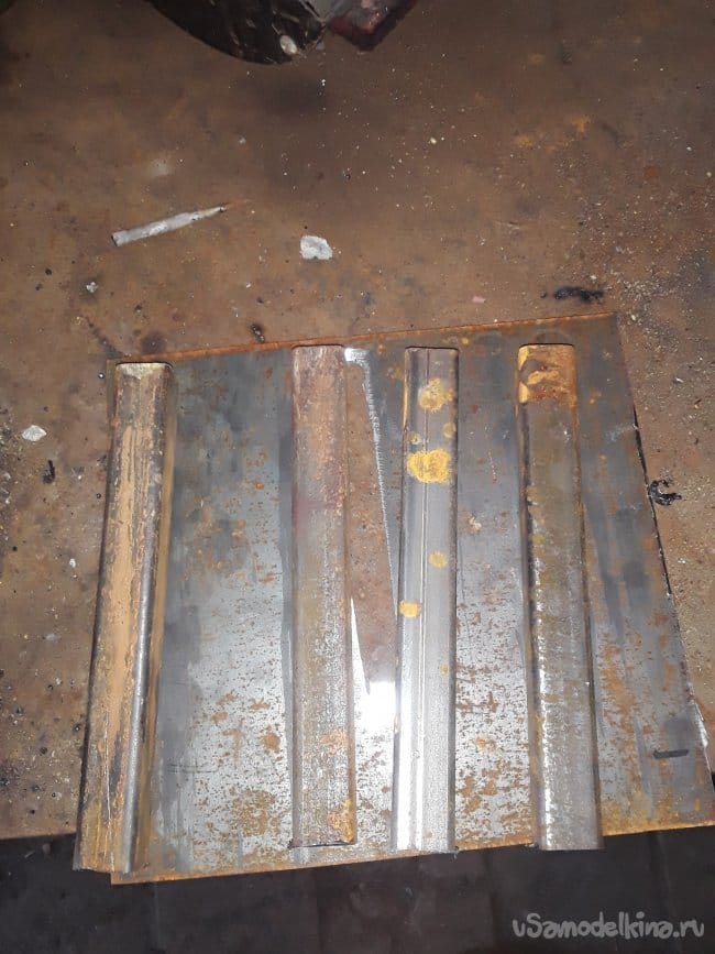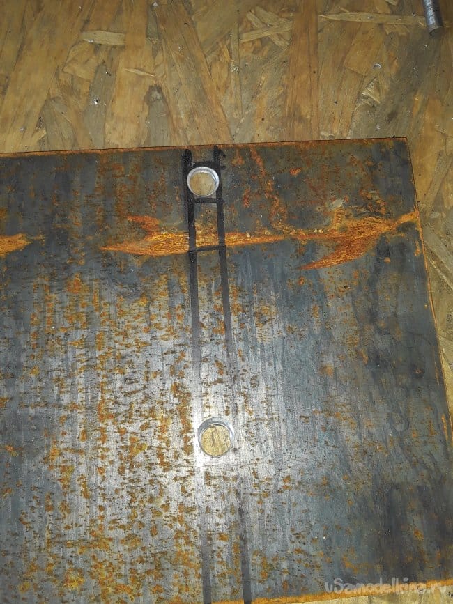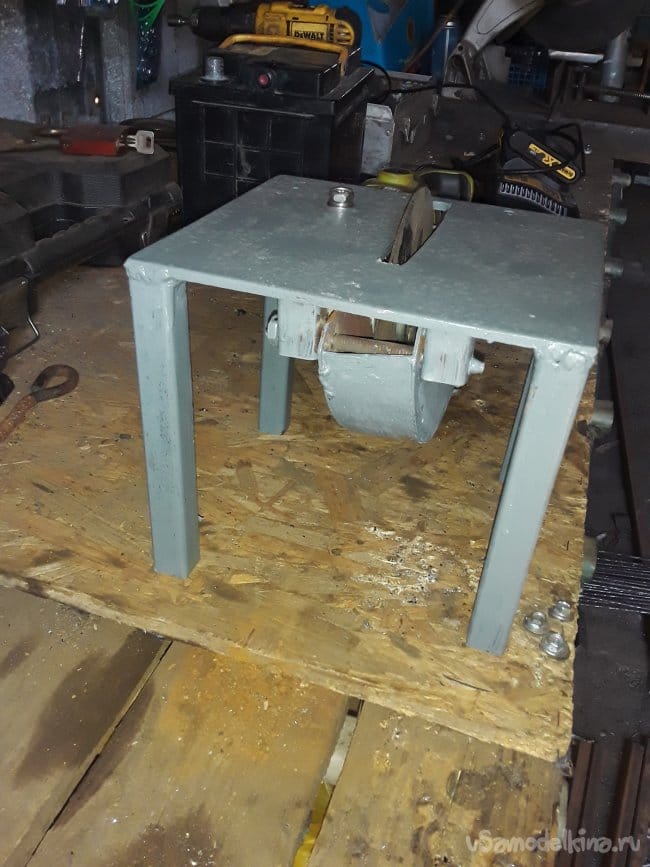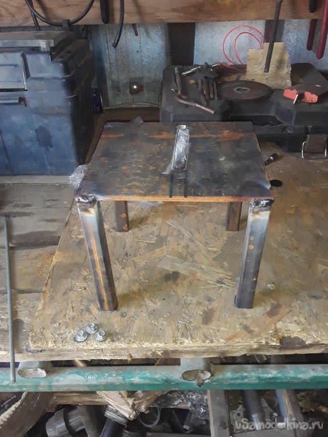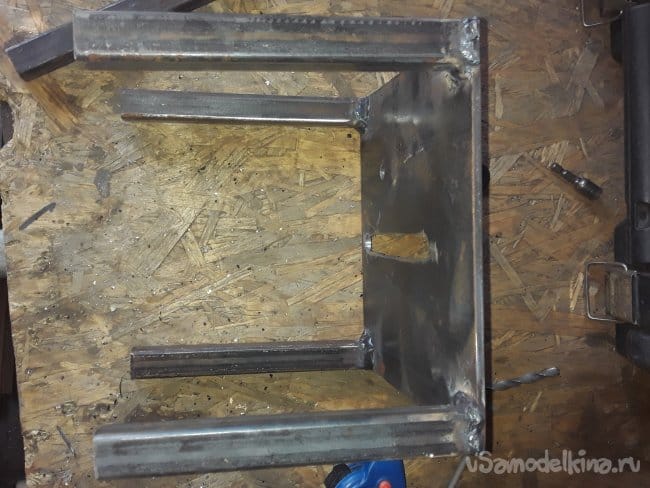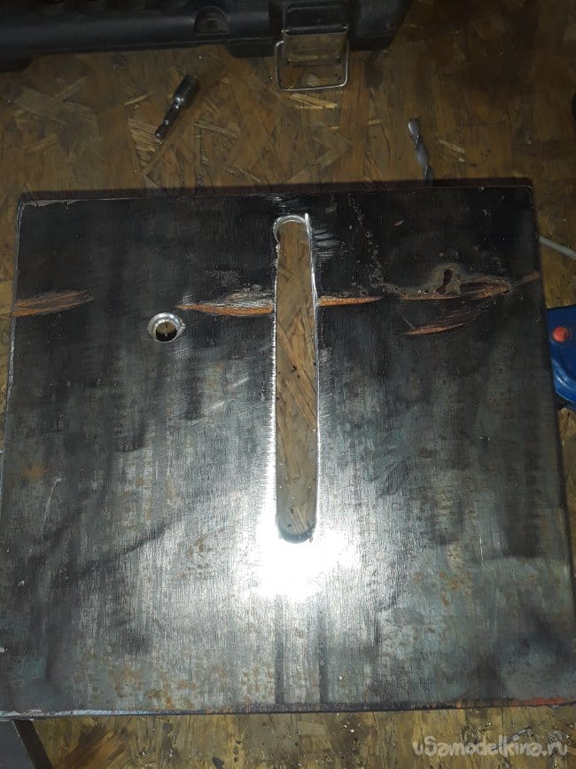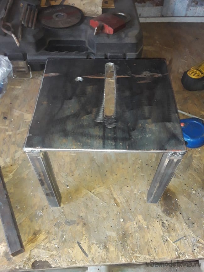Сделав разметку просверливаю два отверстия для того чтобы края распила были ровные и прорезаю болгаркой ширину сделал 2 см для того чтобы можно было ставить лепестковый шлифовочный диск. Далее для того, чтобы удобно было ставить и снимать болгарку привариваю 4 куска профиля 20 на 20, как ножки так будет удобнее. Для крепления самой болгарки просто приложив на свое место делаю отметку и просверливаю отверстие и закручиваю болт на место для крепления рукояти. Такой крепеж вполне очень даже надежный ничего при работе не отвалится проверено.
