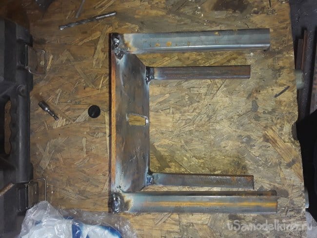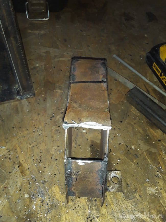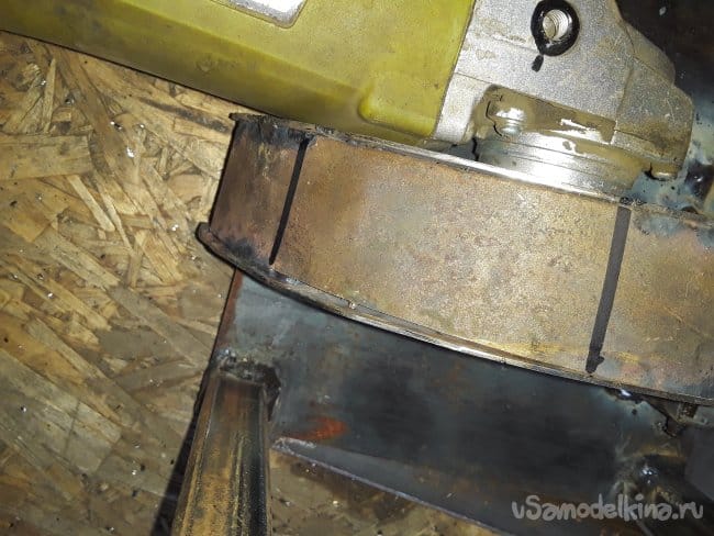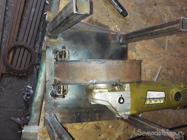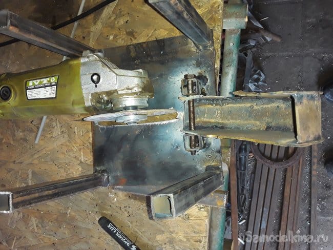 Для крепления защитного кожуха приварил 2 отрезка проф.трубы затем просверлил 2 отверстия по краям и в самом кожухе ставлю длинный болт и все когда надо можно открыть кожух и снят болгарку для замены диска. Для фиксации кожуха приварил уголок и гайку на платформу