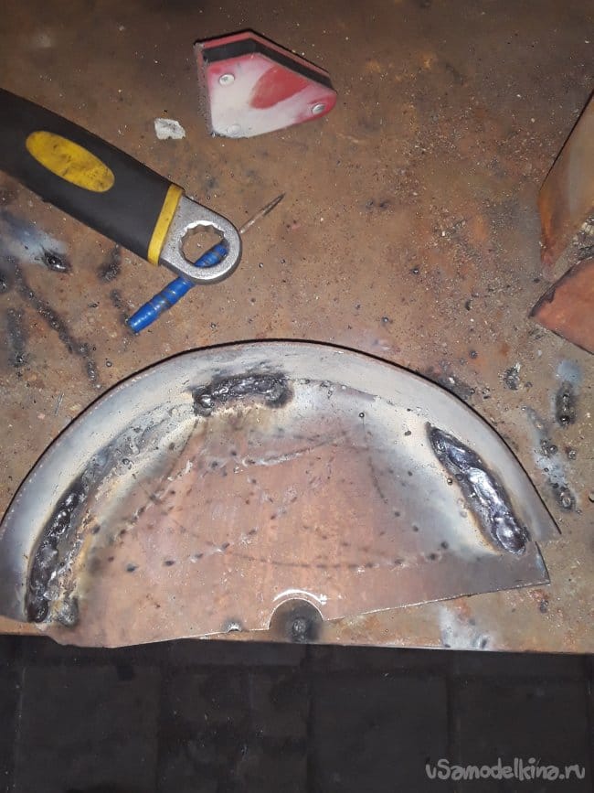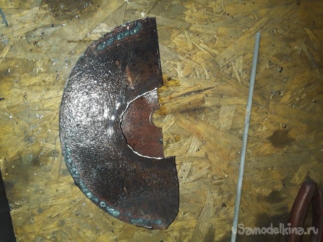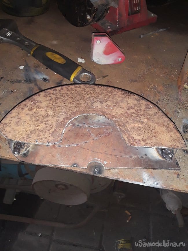 Для изготовления кожуха использовал металл 2мм просто вырезал немного подогнав под нужное место все делаю на глаз без размеров. Вырезов все зажимаю в тиски под нужную ширину и потихоньку подвариваю полосу металла придавая нужную форму в том месте, где будет выход для пыли, и стружки не провариваю бока и просто подрезаю один край и выгибаю под нужный угол вот и все. Для крепления кожуха привариваю два отрезка профиля 20 на 20 мм просверливаю отверстия по краям и через болт креплю кожух вот и все готово ставлю все на свои места и проверяю чтобы не чего не цепляло и работало как надо. Для крепления кожуха привариваю кусок уголка просверлил отверстие и приварил гайку и закрутил болт когда нужно все быстро снимается и настраивается, а самое главное работает.
