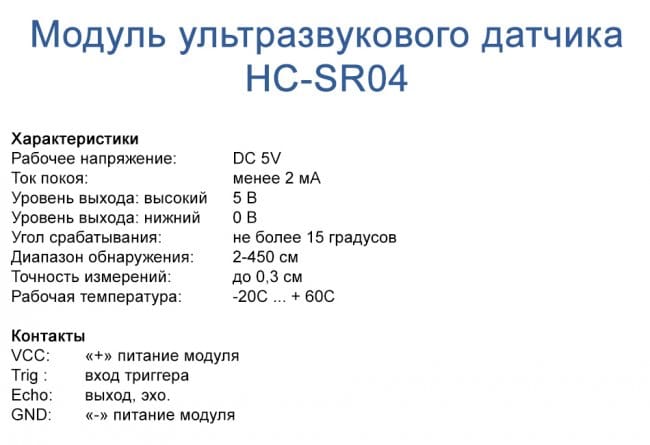 Датчик формирует ультразвуковой сигнал и ожидает его отражение от предмета. При этом он может измерять расстояния от 0,02м до 4м.