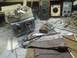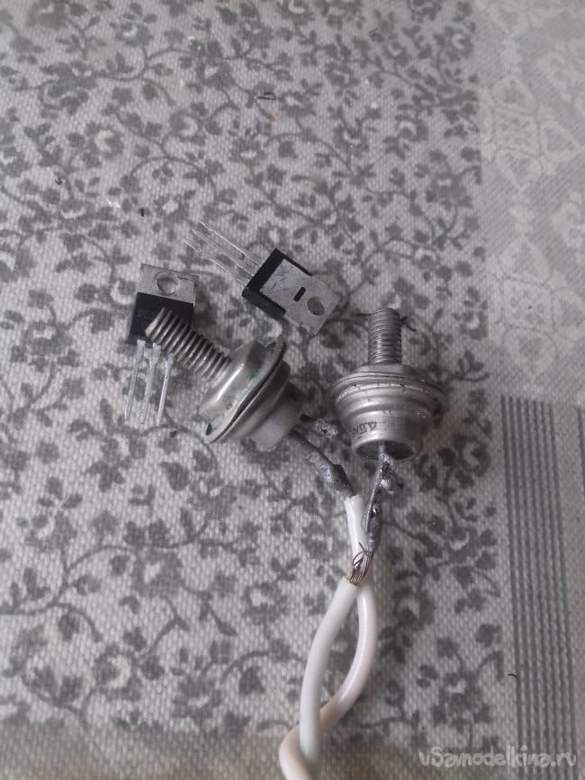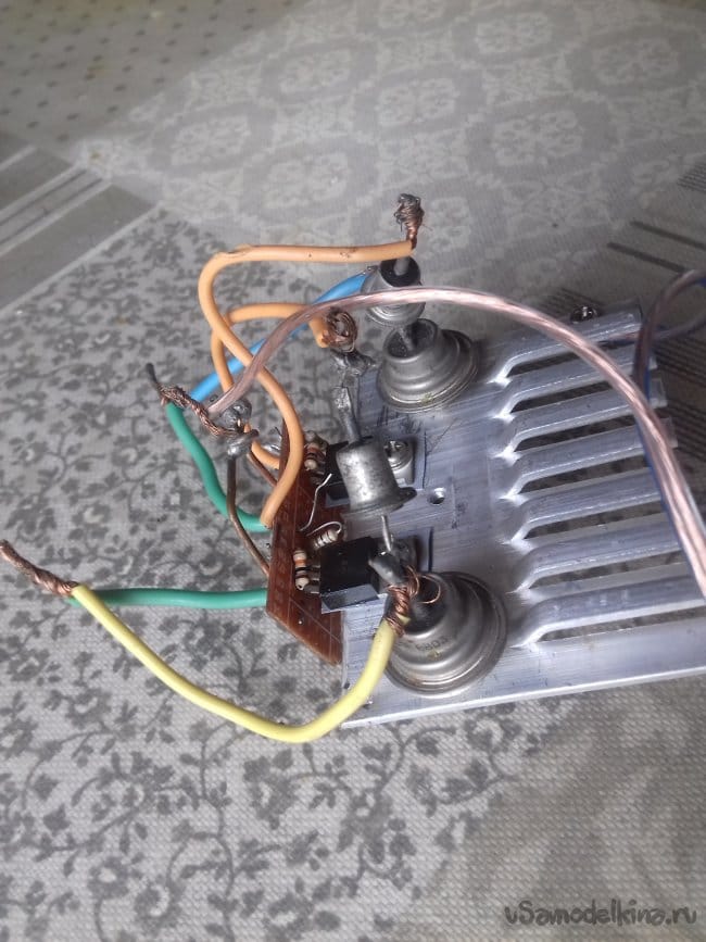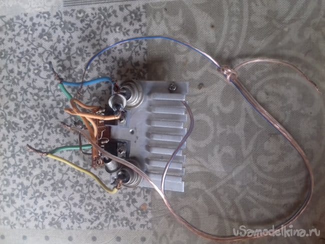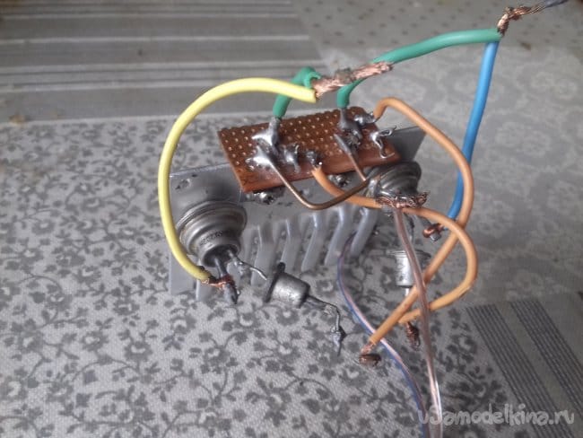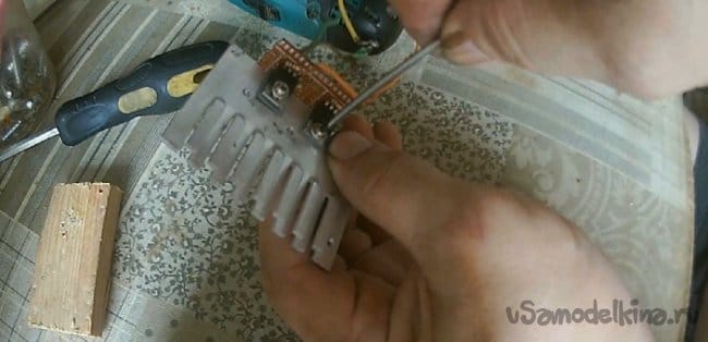 Алюминиевую пластину взял, какая была, просверлил отверстия под транзисторы и тиристоры, припаял сопротивления.