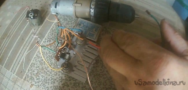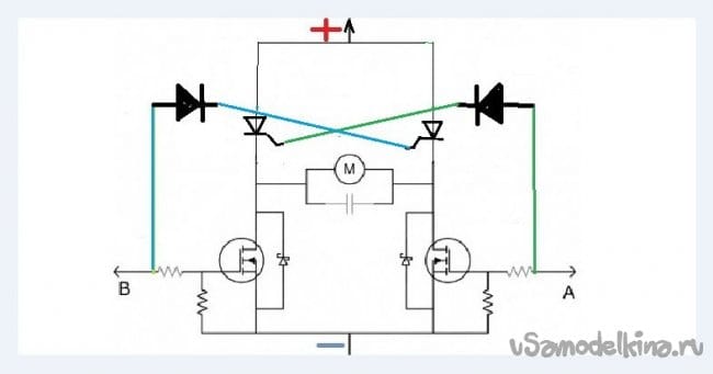 Сначала к выходу Н-моста я подключил вольтметр. Можно видеть, как меняется полярность на выходе, когда подаю сигнал на точки «А» и «В». Затем подключил слабенький электромотор, на шестерне я нарисовал синею точку. Видно как меняется направление вращения шестерни. Ну и в конце взял электромотор с редуктором от дрели, 15 В, 1,2 А. Все прекрасно работает. Главное не перегружать допустимые параметры. Данная сборка рассчитана до 10 А. При запуске электродвигателя происходит скачек по Амперам в два, или в три раза. Это вы можете видеть на видео. При более серьезных нагрузках, полевые транзисторы и тиристоры можно собрать в сборки, или подобрать более мощные.