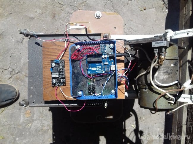 Пластина, она же положительный контакт, к ней гайками прикрутил тиристоры. На управляющие ножки тиристоров припаял диоды. Через диэлектрик и пластиковые чашки шурупами притянул полевые транзисторы. Затворы соединил с диодами, сюда и буду подавать управляющий сигнал. Выход с тиристора соединил с истоком транзистора. Все согласно, приложенной схемы. На этом сборка закончена. Можно подключить к контактам «А» и «В» ARDUINO, через кремниевые транзисторы «P-N-P».