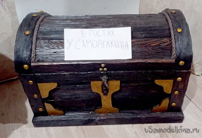 Щели на крышке решил закрыть веревкой. Долго думал, где пустить веревку на нижней части сундука, так сказать для целостности композиции, но так и не нашел куда.