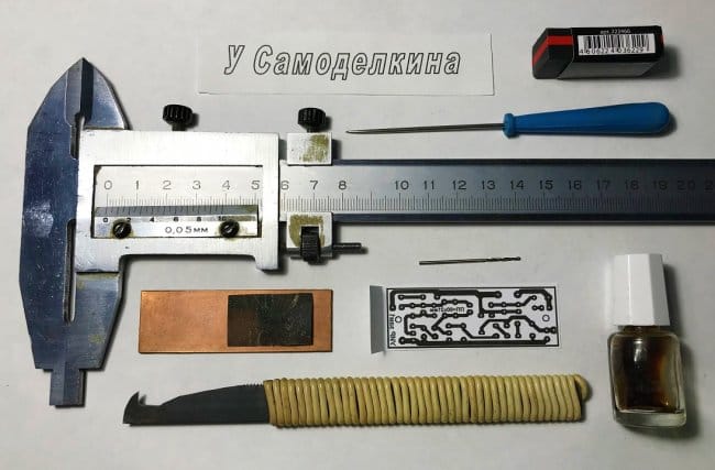 Основные инструменты для изготовления ПП УИР изображены на рисунке 5. Всего несколько операций по термопереносу рисунка ПП на фольгированную сторону платы, травление, очистка от тонера, покрытие канифолью и можно приступать к пайке.