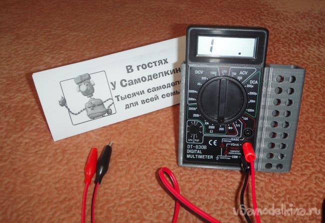 После сборки можно проводить тестовые испытания: берем подставку, вставляем в нее мультиметр, складываем и засовываем в соответствующий отсек провода. Если мультиметр свободно входит в подставку, провода умещаются в отсеке, «нога» отклоняется и удерживает всю конструкцию в вертикальном положении, то подставка успешно прошла испытания!