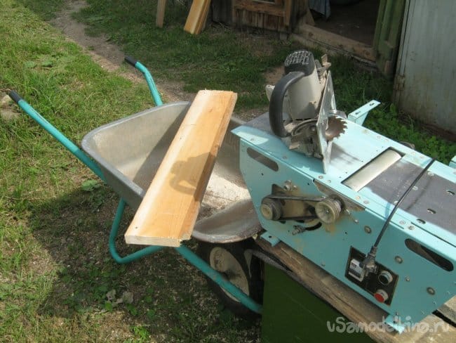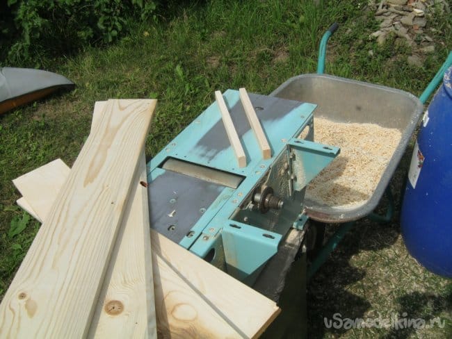 Теплая сухая погода на улице позволяет с комфортом заниматься пыльными столярными работами на открытом воздухе – выволок свой «Могилев» за дверь, перевел в положение «строгание», обработал все детали и довел их толщину до изящной (Фото 4). Хвойные стружки собираю в садовую тачку и набиваю ими пустые пластиковые бочки и мешки – это важный материал, заполнитель для компостирующего туалета. Опять же, подстилка для хомяка.