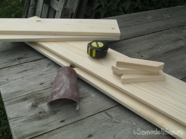 Неширокость конструкции по условиям задачи существенно облегчила работу – не пришлось сплачивать доски в шиты. Самые крупные детали сделаны из стандартной обрезной доски-«дюймовки» хвойных пород. Конечно сухой. Для применения мебельного, это более двух лет в проветриваемом штабеле под крышей.