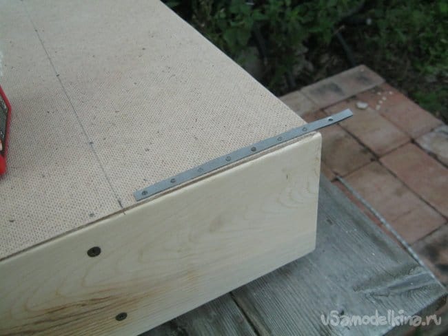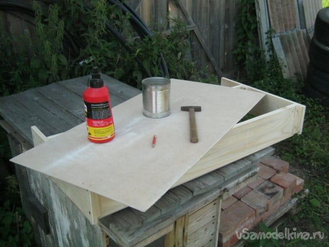 На импровизированном уличном столе – плоской крыше собачьей будки, крупной наждачной бумагой зачистил края вырезанной заготовки от лохмотьев и нанеся на деревяшки клей приколотил по периметру конструкции мелкими гвоздиками (Фото 12).