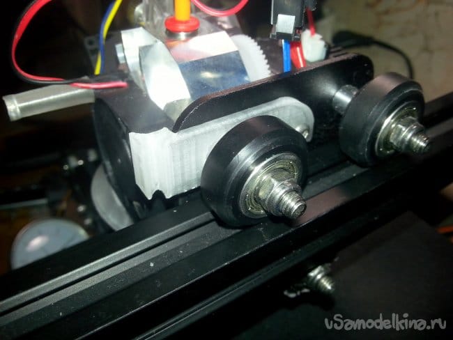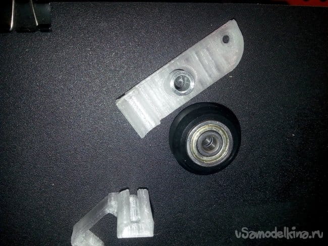 Первым делом открутил правый верхний ролик каретки, и снял его. Втулка вставляется в большое (8 мм) отверстие переходной пластины.