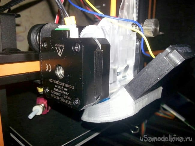 Стоковая голова с хотэном MK8 уже сильно устаревшее решение, да еще и реализованное с системой дистанционной подачи филамента (через удлинительную трубку Bowden). Длина «отката» (возврата пластика для перемещения головки между отдельными элементами без вытекания оного) составила аж 6.4 мм. Это сильно снижает скорость, и делает невозможным печать гибкими (резиноподобными) пластиками.
