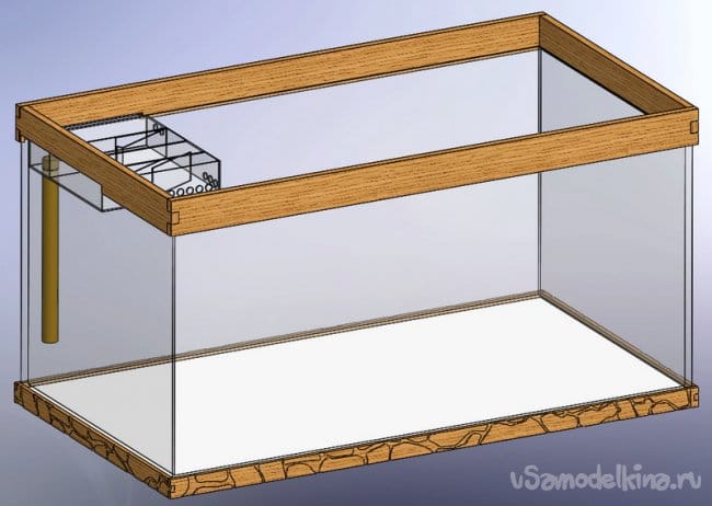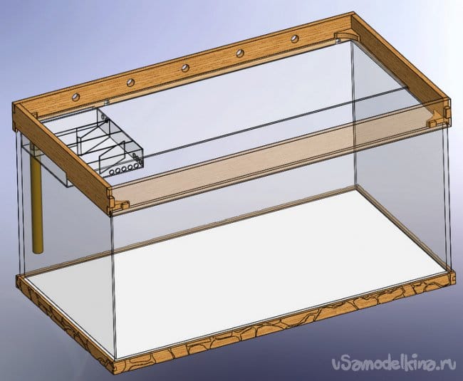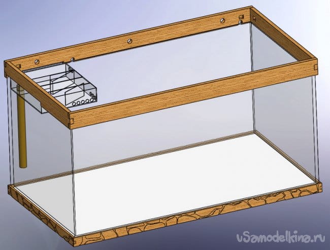 Как вы поняли, я еще сделал квадратные вырезы не на всю глубину. Это для усиления конструкции. Сейчас нарисую деталь угловой связки (косынки) и добавлю оргстекло для защиты от брызг лопающихся пузырьков воздуха. Оргстекло расположу под небольшим наклоном к центру аквариума. Вот: