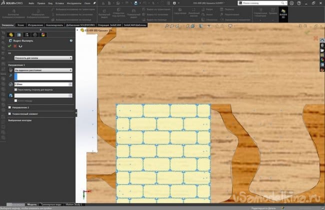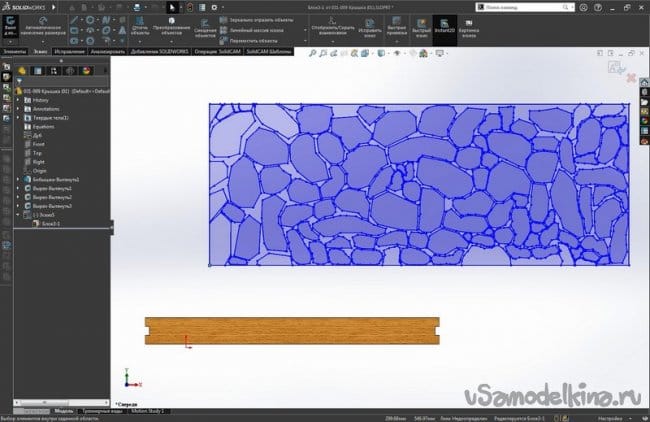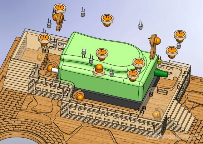 В отмеченных местах делаю углубления на 2 мм. Ножки компрессора имеют форму конуса, поэтому и вырезы под них будут не большие. Это делается для того, что бы компрессор не гулял внутри здания из за своей вибрации при работе. Еще добавляю немного декораций, нарисовал небольшие оградки и разместил их на крышке. Конечно они так же будут устанавливаться в свои пазы, которые тоже уже сделаны. Так же нарисовал новый тротуар. Немного изменил технологию, и на этот раз функцией "Вытянутая бобышка / основание" поднял части рисунка тротуара на 0,5мм. Получилось без косяков, с первого раза.