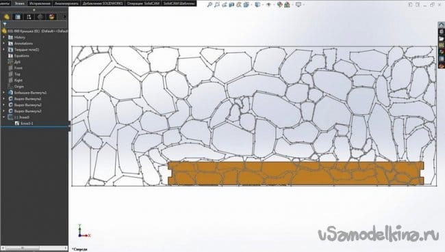 Начинаю прорисовку тропинок с брусчаткой. Разделил нужные места на сектора, нарисовал несколько камней и используя функцию линейного и кругового массивов быстро заполнил будущие дорожки кладкой. В местах, где вышел за размеры дорожек, вручную подправил размер и форму камней.