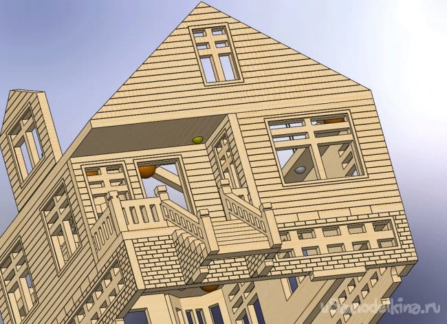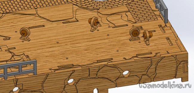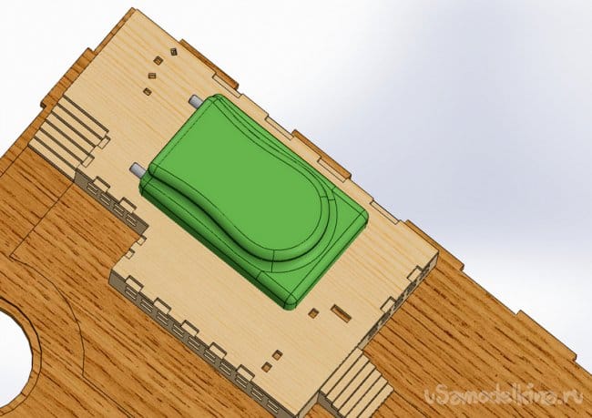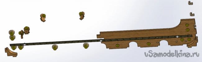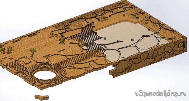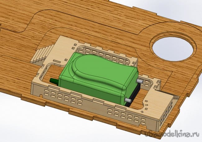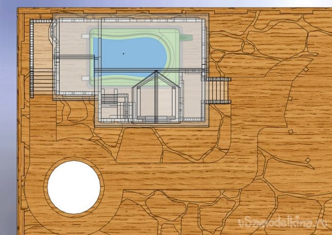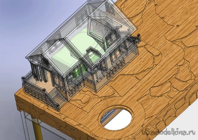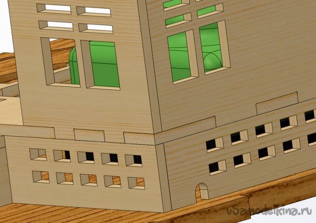 Для исправления, вношу в деталь "пола" изменения. Делаю вырез по возможности максимальный. Этот вырез так же пригодится в будущем для подсвечивания "цокольных оконных проемов" внутренней подсветкой. Оставшиеся участки "пола" - это будущие веранды. В задней части сделал прорези для питающего провода и двух воздушных шлангов.