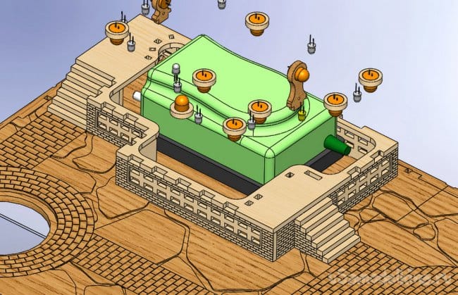На данном этапе работ понадобился кондуктор. Объясню: имеется пока 6 деталей, которые нужно обработать с двух сторон, причем нужно выдержать расположение детали очень точно в координатах станка при ее перевороте. С одной стороны деталей - технологические пазы и карманы, с другой (будет внешней) фрезеровка каменной кладки.