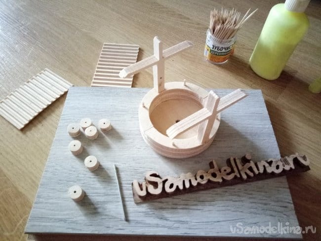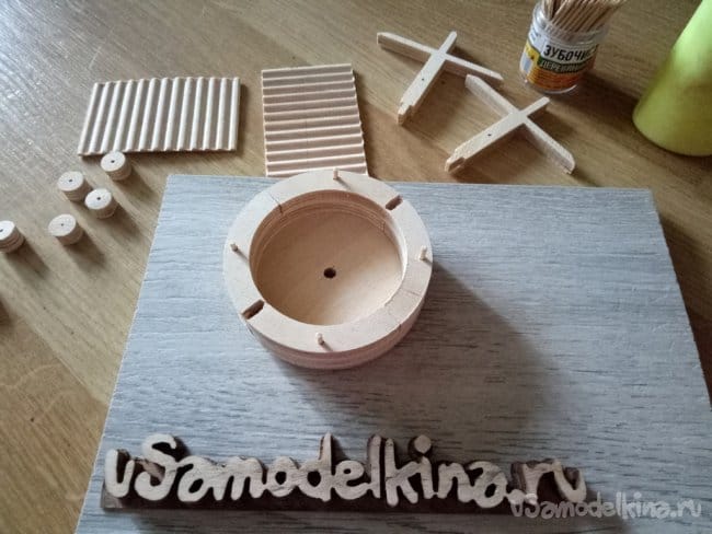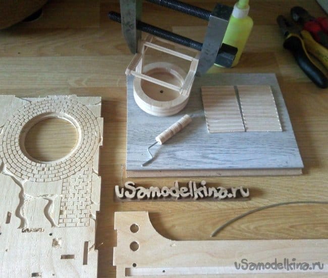 Начал вырезать, пошли первые детали. На фото ниже шлифованные детальки для колодца, в коробке из под фрезы. Но это только начало...