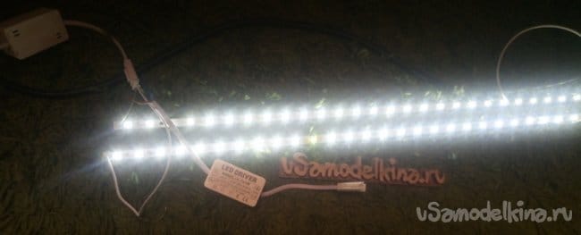Получил из Китая нужные драйвера. Проверил, подключив одну линейку, получилось оОочень ярко. Подключил последовательно вторую - самое то! Хоть и планировал установить одну линейку диодов, и подгоовил для нее паз на 1 мм, но место позволяет, установлю и вторую. При монтаже в дальнейшем будет фото. А пока только эти: драйвер и пара светящихся линеек.