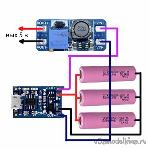 Контроллер заряда я использовал типа 03962A на основе TP4056, он имеет цветовую индикацию окончания заряда, защиту от перегрузки по току, встроенную защита от как от перезаряда, так и от переразряда. (Дополнительно к контактам Ват+ и Ват – данный модуль имеет контакты Out+ и Out-)