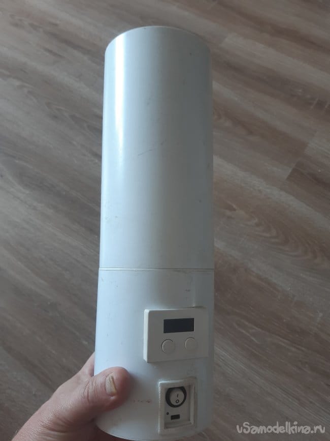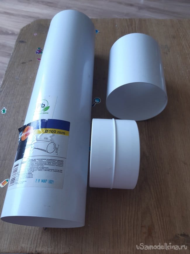 Основная часть корпуса изготовлена из двух отрезков вентиляционной трубы и одного соединителя, диаметром 100 мм. От трубы отрезаются три отрезка. Один – длинной 120 мм для основного корпуса. Второй - длинной 195 мм. для крышки. Третий длинной 90 мм. для крепления насоса.