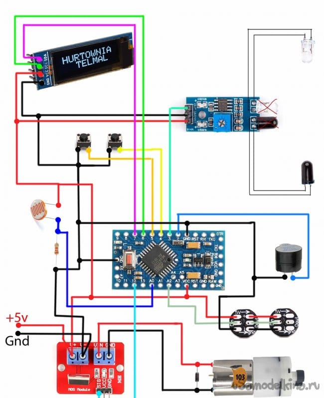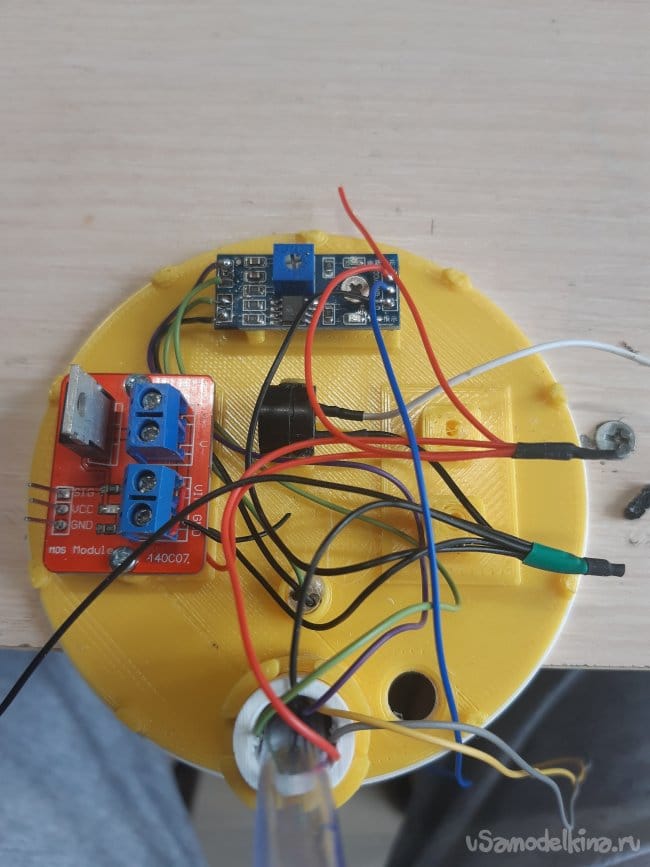 На нижней поверхности рабочего стола размещены: Ардуино, (предварительно залив нее скетч.) ИК модуль, силовой ключ, пьезоизлучатель.