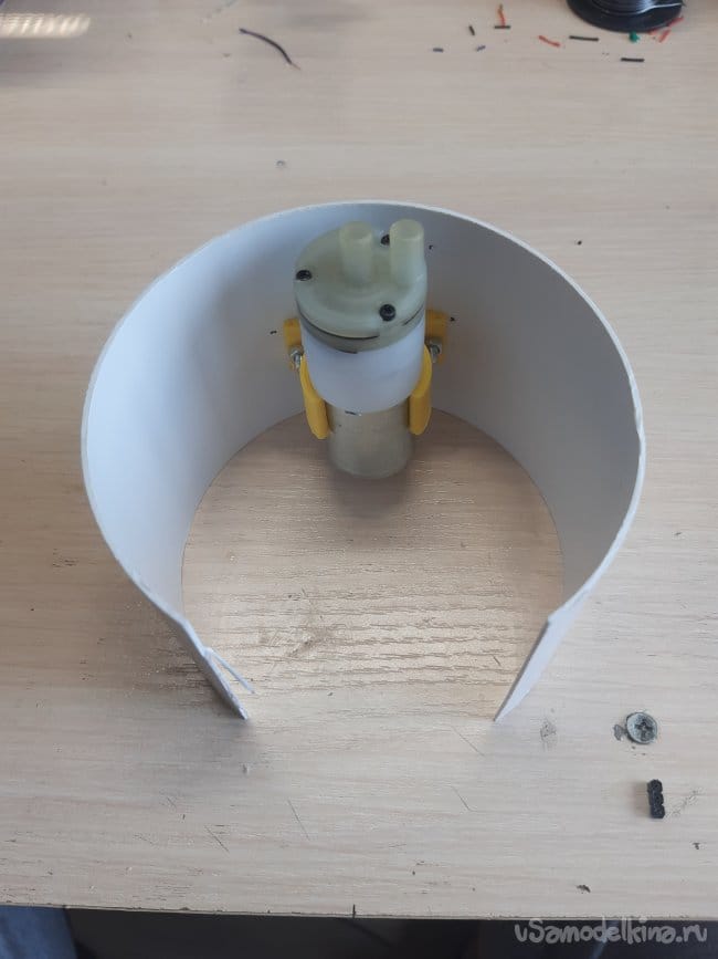 Насос крепится на дополнительную вставку, изготавливается из остатков вентиляционной трубы. Для этого отрезаем кусок длинной 90 мм. Удаляем из этого отрезка сектор, на 15- 20 мм шире выреза под экран.