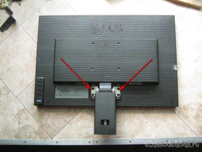 Нетравматичная, без вандализма разборка современной пластмассовой техники, та еще задача. Помогло и руководство по ремонту [1]. Первым долгом снял подставку (нажать клавишу сзади ноги). Пациента - лицом на стол. Снять подковырнув плоской отверткой пластиковые декоративные накладки на шарнире ноги и отвернуть винты шарнира (Фото 2). Ногу с шарниром и винтиками в сторону, в коробку.