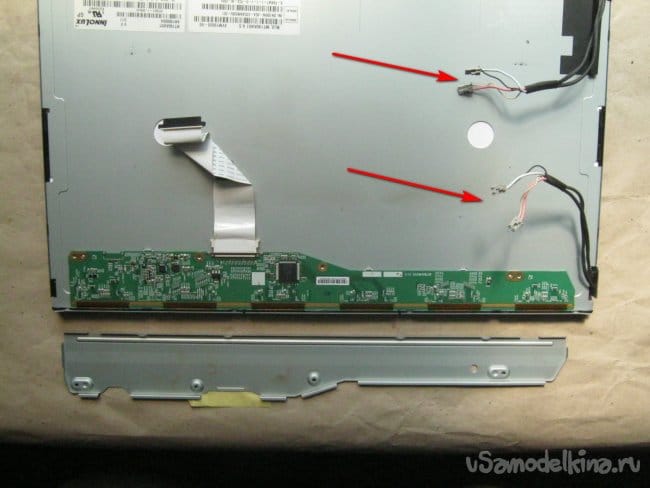 Фото 7. Модуль ЖК панели с открытой управляющей платой и подсветкой. Стрелочками отмечены высоковольтные выводы с разъемами от 4 ламп подсветки.